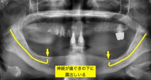 通常であれば、下アゴに通っている神経は、骨によって守られており、入れ歯を支える歯ぐきの部分には露出することはありません。 この方の場合は、著しく骨が吸収してしまったことで、このように神経が歯ぐきの真下に露出してしまっていました。